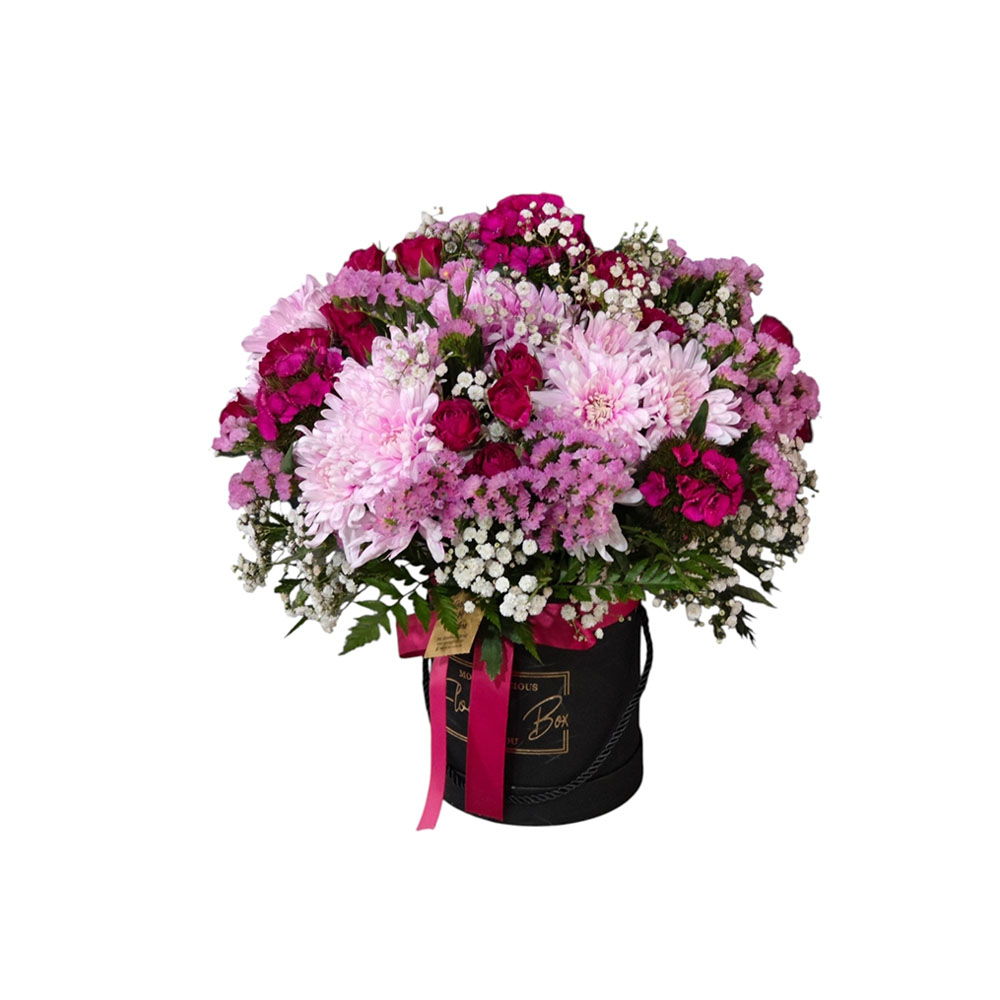 Varieties of colorful seasonal and classic flowers arranged in black / white / Pink Box.